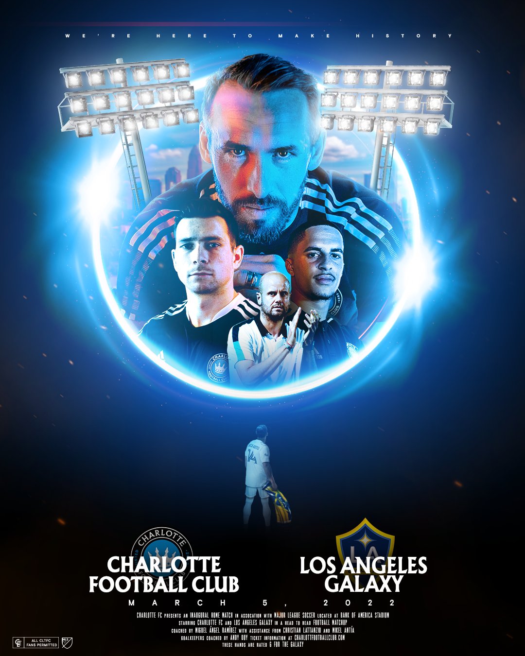 Charlotte FC vs. LA Galaxy Charlotte FC - Powered by Spinzo. Charlotte FC vs. LA Galaxy. March 5, 2022 at 8:00pm. The date is set... Let's Make History Together. Charlotte FC's Inaugural Home Match. |. March 5, 2022.