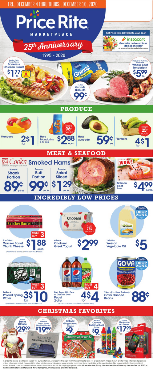 Price Rite Weekly Ad, Weekly Circular Price Rite Weekly Ad January 21 - January 27, 2022. Baking Essentials! Browse the current Price Rite online circular special deals and hot offers, valid 01/21/2022 - 01/27/2022: -$2.88 4 lb bag Navel Oranges; $0.39/lb Bowl & Basket Chicken Leg Quarters; Price Rite Weekly Circular January 14 - January 20, 2022. Whole Pork Shoulder on Sale!