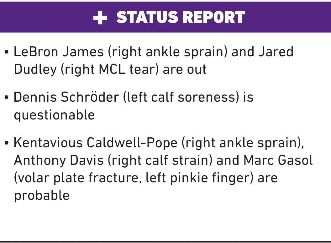 Raptors vs. Lakers: Game preview, TV channel, start time, injury... Raptors vs. Lakers injury report. OG Anunoby remains out for the Raptors. Malachi Flynn has also been ruled out for Friday's game. Get the latest NBA Los Angeles Lakers Injuries from NBC Sports EDGE Washington Commanders. Injury Report. Toronto Blue Jays. Washington Nationals. Injury Report. Depth Charts. Daily Lineups. Lakers Nation: Lakers injury report for Game … | HoopsHype - Via NBA Injury Report #LakeShow #Lakers #WholeNewGame pic.twitter.com/LEsxX6hB3m. James has missed the past 11 games since suffering the injury on Christmas Day at the Golden... Lakers release injury report for Sunday's game vs.... - Lakers Daily Report: Lakers coaching staff made a 'push' for Russell Westbrook to be traded before the Last season, key injuries to both players resulted in struggles for the team during the latter part of the...
