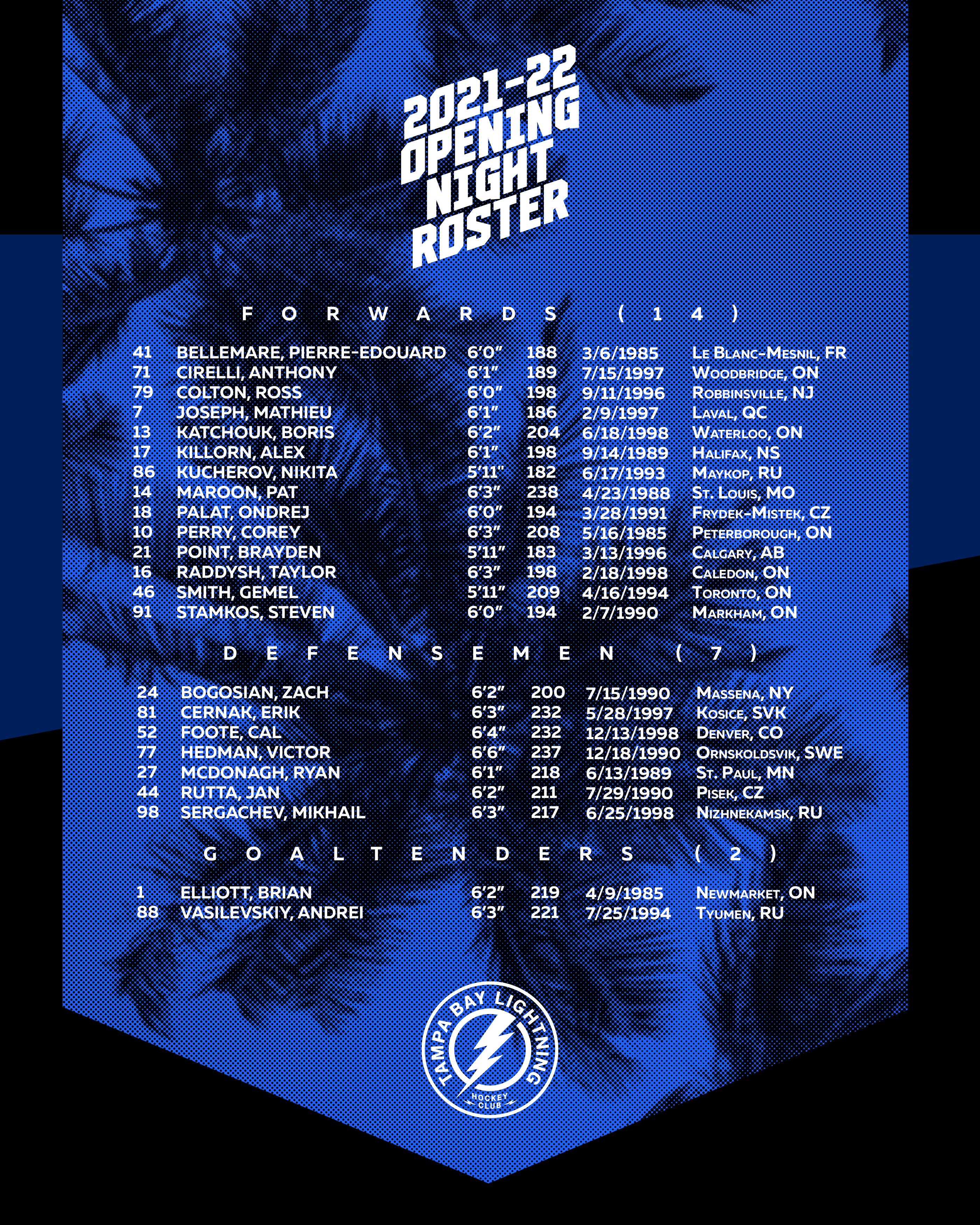 2021-22 Tampa Bay Lightning Roster - NHL Players ... Full Tampa Bay Lightning roster for the 2021-22 season including position, height, weight, birthdate, years of experience, and college. Find out the latest on your favorite NHL players on ...