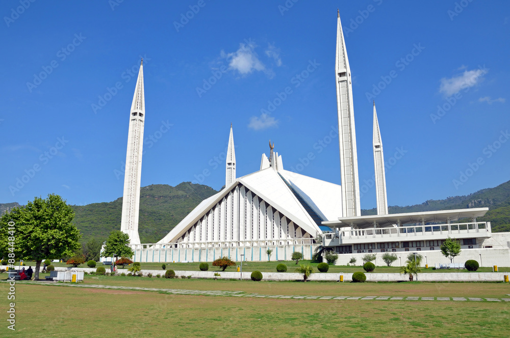 Faisal Mosque, Islamabad | Pakistan Embassy Tokyo Japan Shah Faisal Masjid, also known as Faisal Mosque, located in the start of Margala hill sector E-7 Islamabad Pakistan The mosque's unusual design is a departure from the long history of South Asian Islamic architecture, fusing contemporary lines with the more traditional look of an Arab Bedouin's tent, with its large triangular prayer hall and ...