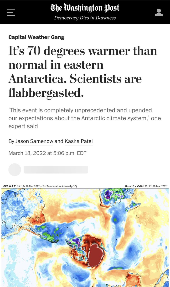 It's 70 degrees warmer than normal in eastern Antarctica ... It's 70 degrees warmer than normal in eastern Antarctica. WaPo Mar 19, 2022 3:40 PM ET. The coldest location on the planet has experienced an episode of warm weather this week unlike any ever observed, with temperatures over the eastern Antarctic ice sheet soaring 50 to 90 degrees above normal. The warmth has smashed records and shocked ...